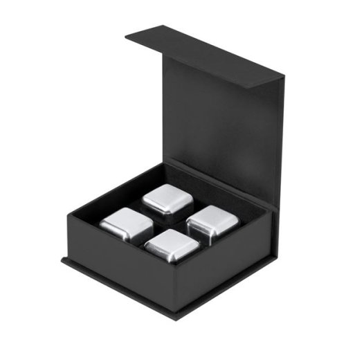 4-dílná opakovaně použitelná sada chladících kostek z nerezové oceli v černé dárkové krabičce Rozměr: 9,5 x 9 x 3,5 cm