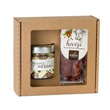 Sada obsahuje: Hovězí klobásu s pepřem, fermentovaný trvanlivý masný výrobek (90 g), směs nepražených ořechů a lyofilizovaných sýrů (80g) Rozměr: 18,4 x 17 x 7,3 cm
