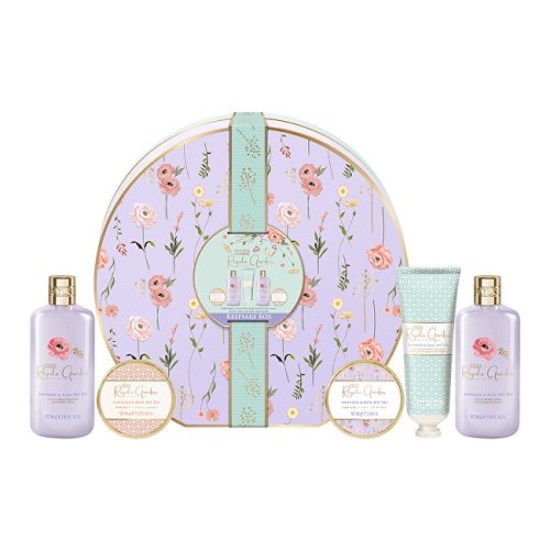 Tato nádherná dárková sada bude rozmazlovat Vaši pokožku pečujícími tělovými produkty s vůní levandule a šípkového čaje. Krémové tělové mýdlo a sprchový krém šetrně čistí pokožku a společně s koupelovými krystaly provoní celé tělo příjemnou vůní. Krém na ruce a tělové máslo se postarají a maximální hydrataci a výživu a skvěle doplní každodenní rutinní péči o pokožku. Royale Garden představuje romantickou kolekci inspirovanou tradiční anglickou zahradou. Spojuje květinové motivy s pastelovými tóny fialové a mátové, doplněné zlatými detaily. Květinový design a jemná vůně levandule a šípku vytvářejí něžnou kolekci pečujících produktů pro každou ženu. Vlastnosti:• čistí, hydratují a pečují o pokožku celého těla• s dlouhotrvající vůní levandule a šípku• dobře se vstřebávají do pokožky• v nádherném dárkovém boxu s květinovým potiskem Tělové mýdloTělové mýdlo vytváří bohatou pěnu, která jemně čistí pokožku celého těla. Zanechá ji hebkou na dotek a krásně provoněnou vůní levandule a šípkového čaje.Použití: Naneste na vlhkou pokožku, napěňte a opláchněte. Sprchový krém Nádherně hladký a bohatý sprchový krém je šetrný k pokožce, účinně čistí a vytváří intenzivní pěnu. Zanechá pokožku hydratovanou a jemně provoněnou.Použití: Naneste na vlhkou pokožku, napěňte a důkladně opláchněte Tělové másloTělové máslo s obsahem bambuckého másla dodá pokožce těla potřebnou hydrataci, intenzivní výživu a zároveň uleví od pocitu suchosti. Zanechá ji hebkou, vláčnou a příjemně provoněnou květinovými tóny.Použití: Naneste na suchou a čistou pokožku. Vmasírujte, dokud se zcela nevstřebá. Krém na rucePečující krém na ruce intenzivně hydratuje a zanechává pokožku rukou hebkou a vláčnou.Použití: Naneste na suché a čisté ruce. Vmasírujte do pokožky, dokud se úplně nevstřebá. Koupelové krystalkyKrystalky do koupele se zklidňující květinovou vůní dopřejí tělu i mysli příjemný odpočinek během koupele. Jsou šetrné k pokožce, nevysušují a zanechávají pocit hebkosti po celém těle.Použití: Nasypete do teplé vodní lázně a nechte rozpustit. Doplňující informace:• Vegan & Cruelty Free