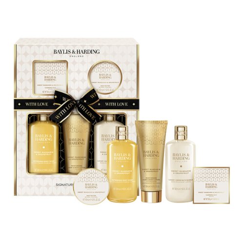 Tato nádherná dárková sada je symbolem luxusu ve Vaší koupelně. Připravte se na jedinečný zážitek a rozmazlujte svou pokožku pomocí této exkluzivní kolekce produktů s energickou vůní sladké mandarinky, grapefruitu a něžného jasmínu. S přicházejícími Vánocemi je to také dokonalý dárek pro ty, kdo si zaslouží chvíle odpočinku a péče ve víru svátečního shonu. Tato sada je nejen krásným důkazem lásky, ale také praktickým darem, který vybízí k relaxaci. S touto sadou pod vánočním stromečkem uděláte někomu opravdu šťastné Vánoce. Ikonická kolekce Sweet Mandarin & Grapefruit propojuje luxusní péči s nadčasovým Art Deco stylem. Elegantní kombinace bílé, zlaté a geometrických vzorů podtrhuje slavnostní atmosféru této kolekce. Nezaměnitelná vůně se svěžími tóny citrusů a jasmínu potěší smysly a promění každodenní péči v malý rituál. Vlastnosti:• čistí, hydratují a pečují o pokožku celého těla• s dlouhotrvající, příjemnou vůní citrusů a jasmínu• dobře se vstřebávají do pokožky• v elegantním, luxusním balení s mašlí Sprchový gelOsvěžující sprchový gel vytváří bohatou pěnu, která jemně čistí pokožku celého těla. Zanechá ji hebkou na dotek a krásně provoněnou vůní citrusů a jasmínu.Použití: Naneste na vlhkou pokožku, napěňte a opláchněte. Pěna do koupeleVytváří bohatou a krémovou pěnu, která hydratuje a vyživuje pokožku celého těla. Zanechá ji hebkou, hladkou a příjemně provoněnou.Použití: Pod proudem vody vlijte do teplé vodní lázně. Mléko na tělo a ruceVyživující mléko dodává pokožce těla potřebnou hydrataci a úlevu od pocitu suchosti, zanechává ji hebkou, vláčnou a provoněnou vůní citrusů a jasmínu.Použití: Naneste na suchou a čistou pokožku a vmasírujte dokud se zcela nevstřebá. Tělové másloTělové máslo dodá pokožce těla potřebnou hydrataci, intenzivní výživu a zároveň uleví od pocitu suchosti. Zanechá ji hebkou, vláčnou a příjemně provoněnou vůní citrusů a jasmínu.Použití: Naneste na suchou a čistou pokožku. Vmasírujte, dokud se zcela nevstřebá. Tuhé mýdloTuhé mýdlo odstraňuje nečistoty z pokožky rukou bez nepříjemného vysušování. Vytváří bohatou pěnu a zanechává dlouhotrvající, svěží vůni.Použití: Promněte ve vlhkých dlaních, napěňte a opláchněte. Doplňující informace:• Vegan & Cruelty Free