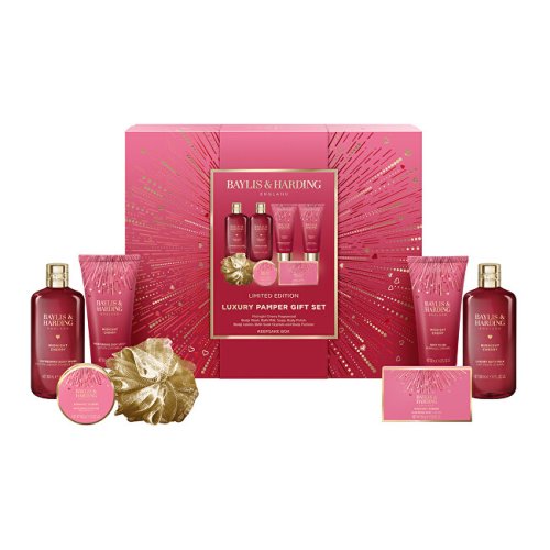Tato nádherná dárková sada je symbolem luxusu ve vaší koupelně. Připravte se na jedinečný zážitek a rozmazlujte svou pokožku pomocí této exkluzivní kolekce produktů se šťavnatou vůní třešní, mandlí a likéru. S přicházejícími Vánocemi je to také dokonalý dárek pro ty, kdo si zaslouží chvíle odpočinku a péče ve víru svátečního shonu. Tato sada je nejen krásným důkazem lásky, ale také praktickým darem, který vybízí k relaxaci. S touto sadou pod vánočním stromečkem uděláte někomu opravdu šťastné Vánoce. Kolekce Midnight Cherry s vůní sladkokyselé třešně, jemných mandlí a kapky likéru v sobě spojuje sváteční atmosféru a hřejivé kouzlo zimních večerů. Výrazný design v tónech rudé a růžové se zlatými detaily dodává každému produktu slavnostní nádech – ideální pro chvíle rozmazlování nebo jako luxusní dárek pod stromeček. Vlastnosti:• čistí, hydratují a pečují o pokožku celého těla• se šťavnatou vůní třešní, mandlí a likéru• dobře se vstřebávají do pokožky• v elegantním, luxusním balení Sprchový gelGel šetrně čistí pokožku, zanechává ji hebkou na dotek a vytváří bohatou pěnu, zatímco uvolňuje dlouhotrvající vůni.Použití: Aplikujte na vlhkou pokožku, vytvořte bohatou pěnu a poté důkladně opláchněte. Mléko do koupeleKrémové mléko do koupele podpoří relaxační rituál a dopřeje pokožce těla ještě větší hebkost a hydrataci.Použití: Přiměřené množství mléka vlijte do teplé vodní lázně. Mléko na tělo a ruceVyživující mléko dodává pokožce potřebnou hydrataci a úlevu od pocitu suchosti, zanechává ji hebkou, vláčnou a příjemně provoněnou.Použití: Naneste na suchou a čistou pokožku a vmasírujte dokud se zcela nevstřebá. Tuhé mýdloTuhé mýdlo odstraňuje nečistoty z pokožky rukou bez nepříjemného vysušování. Vytváří bohatou pěnu a zanechává dlouhotrvající, ovocnou vůni.Použití: Promněte ve vlhkých dlaních, napěňte a opláchněte. Krystaly do koupeleVoňavé krystalky dodají koupeli nový rozměr. Provoní celou lázeň a zanechají pokožku hebkou a hladkou na dotek.Použití: Nasypte do teplé vodní lázně, ponořte se do smyslné vůně a relaxujte. Tělový peelingJemný tělový peeling s vůní třešní, mandlí a likéru šetrně odstraňuje odumřelé kožní buňky a zanechává pokožku hladkou, hebkou a svěží. Pomáhá obnovit přirozený vzhled pokožky a připravuje ji na další péči.Použití: Naneste na vlhkou pokožku a jemně masírujte krouživými pohyby. Poté důkladně opláchněte. Používejte 1–2× týdně. Mycí houbaHouba dokonale zbaví pokožku špíny a nečistot. Zároveň šetrně exfoliuje, odstraní odumřelé buňky, masíruje a podporuje krevní oběh. Skutečný zázrak pro Vaši pokožku. Doplňující informace:• Vegan & Cruelty Free