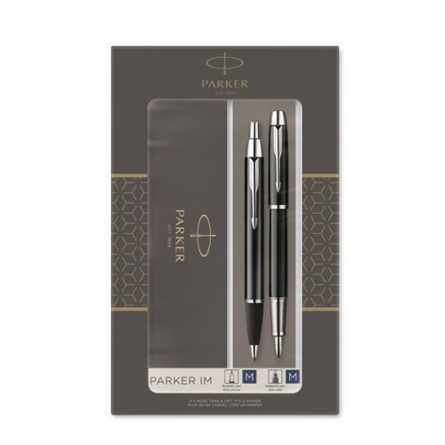 Dárková sada Parker IM plnicí pero + kuličkové pero Řada Parker IM přináší kuličkové a plnicí pero s elegantním kovovým tělem a jednoduchým designem Kuličkové pero má lesklý černý lak a chromové doplňky …