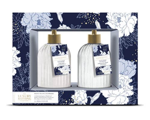 Tekuté mýdloJemné mýdlo šetrně čistí pokožku bez nepříjemného vysušování. Zanechává ruce hebké a příjemně provoněné.Použití: Naneste na vlhké ruce, napěňte a důkladně opláchněte. Krém na ruceVýživné mléko dodá pokožce potřebnou hydrataci a úlevu od pocitu suchosti. Zanechává ji hebkou, vláčnou a příjemně provoněnou.Použití: Naneste na suchou a čistou pokožku, vmasírujte, dokud se nevstřebá. Pivoňka, Broskev & MalinaKvětinová vůně pivoněk a růží je doplněná vůní malin, pomerančů a slaďoučkých broskví. Nádherně vyvedené květiny na tmavomodrém podkladu dodává kolekci elegantní a ženský vzhled. Neužívejte vnitřně. Vyhněte se kontaktu s očima, vyhněte se okolí očí. Při jakýchkoliv známkách podráždění přestaňte používat. Bez parabenů, silikonů a ftalátů Veganské a Cruelty free