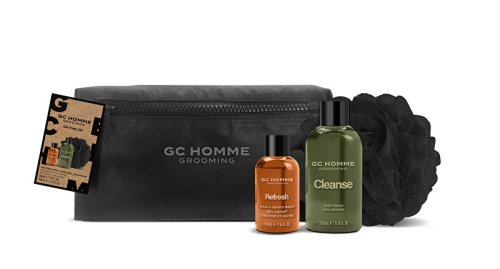 Sprchový gel 150 ml Šampon na vlasy a vousy 50 ml Mycí houba 1 ks Kosmetická taška 1 ks