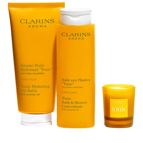 Hydratační tělový balzám (Tonic Hydrating Oil-Balm) 200 ml Tonizační koupel (Tonic Bath & Shower Concentrate) 200 ml Vonná svička Tonic (Scented Candle) 35 g Kosmetická taška 1 ks