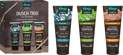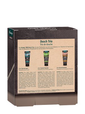 Na dobrodružné cesty, běžná všední rána i sportovní tréninky. Pánské sprchové gely dodají odvahu, radost a energii. V dárkové sadě Kneipp Sprchové trio pro muže najdete 3 sprchové gely se spoustou přírodních výtažků a olejů. Všechny můžete použít na tělo i vlasy. Díky kokosovému oleji a panthenolu dodají potřebnou dávku péče a hydratace. Sprchové gely obsahují esenciální oleje, které podporují sílu, optimismus, odvahu i koncentraci. Ucítíte například rozmarýn, pomerančovou kůru, eukalyptus, borovici nebo citronovou trávu. Sada obsahuje: