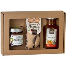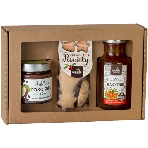 Sada obsahuje: Vánoční perníčky (40 g), jablkový čokokrém z belgické hořké čokolády s kešu (200 g), Rakytník, nápojový koncentrát ze 100% přírodních surovin (250 ml)
