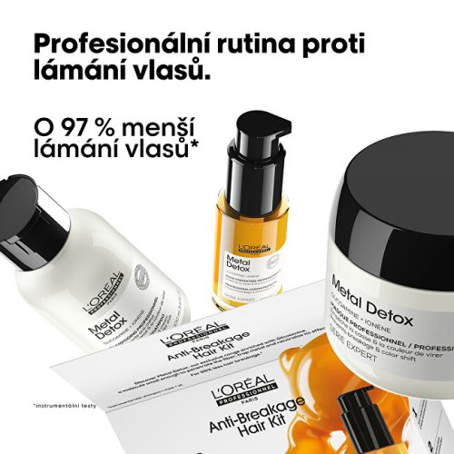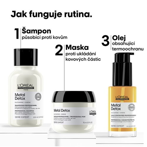 Šampon pro barvené a poškozené vlasy Serie Expert Metal Detox (Professional Shampoo) 100 ml Maska pro barvené a poškozené vlasy Serie Expert Metal Detox (Professional Mask) 75 ml Koncentrovaný olej proti usazovaní kovových částic Metal Detox (Professional Concentrated Oil) 30 ml