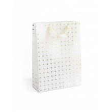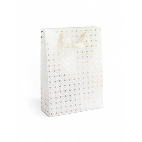 Papírová dekorativní dárková taška, rychlý pomocník při balení vašich dárků Rozměry: velikost L - 33 x 10 x 24 cm Barva: bílá Motiv: zlatý metalický geometrický vzor Počet ks v balení: 5 ks