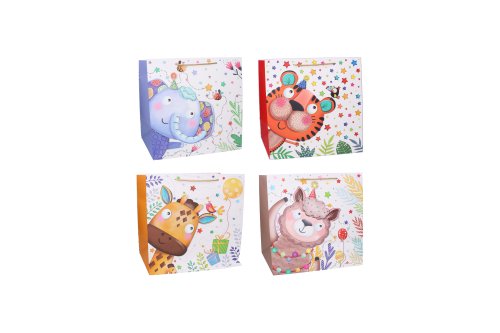 Dárková taška o velikosti L 38x38x20 cm Dětská. 4 varianty zvířátek: tygr, slon, ovečka a žirafa.