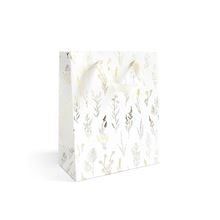 bílá papírová taška s metalickým potiskem lučních rostlin vhodná pro elegantní a rychlé zabalení dárku taška je lepená, ploché dno stužková ucha krémové barvy rozměr 25x10x20 cm balení 5 ks