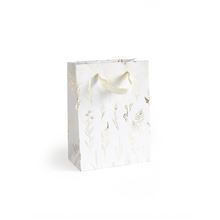 bílá papírová taška s metalickým potiskem lučních rostlin vhodná pro elegantní a rychlé zabalení dárku taška je lepená, ploché dno stužková ucha krémové barvy rozměr 20x8x15 cm balení 5 ks
