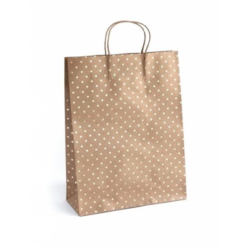 Papírová dekorativní dárková taška z kraftového papíru, rychlý pomocník při balení vašich dárků Rozměry: velikost XL - 39 x 12 x 30 cm Barva: tmavě béžová Motiv: zlaté metalické tečky Počet ks v balení: …