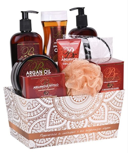 Krásné dárkové balení kosmetiky s bio arganovým olejem pro péči o pokožku těla i obličeje ve stylové papírové krabičce. Arganový olej neboli marocký poklad je jedním z nejvzácnějších olejů na světě. Přirozeně chrání pokožku, navrací jí pružnost a jemnost. Znatelně vyhlazuje drobné vrásky, má skvělé hydratační, vyživující a regenerační účinky. Lze jej použít i k regeneraci poškozených vlasů a nehtů. Je vhodný pro všechny typy pokožky a pleti. Díky svému jedinečnému složení je považován za přírodní elixír krásy a mládí. Dárkové balení obsahuje: