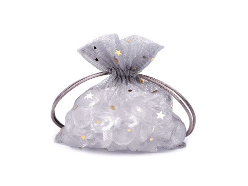 Dárkový pytlíček je vyrobený z tylu. Zdobí jej lesklý metalický potisk hvězdiček. Snadno se uzavírá pomocí dvou stahovacích saténových šňůrek. Do pytlíku skryjete drobné dárky nejen na narozeniny, ale také na Vánoce.