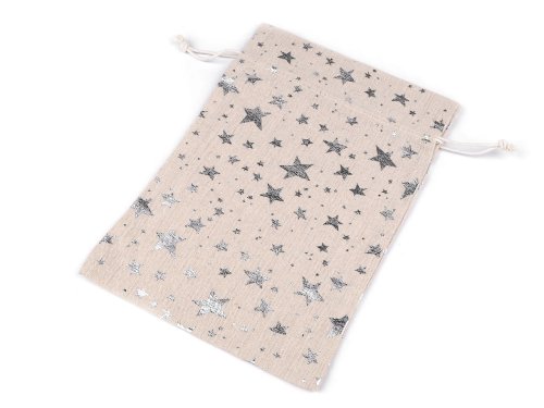 Dárkový pytlík s metalickým potiskem hvězd poslouží na zabalení malých dárků, ale může být i krásnou dekorací na Vánoce. Len, ze kterého je vyrobený, je kvalitní a pevný. Pytlík snadno uzavřete pomocí dvou bavlněných stahovacích šňůrek.