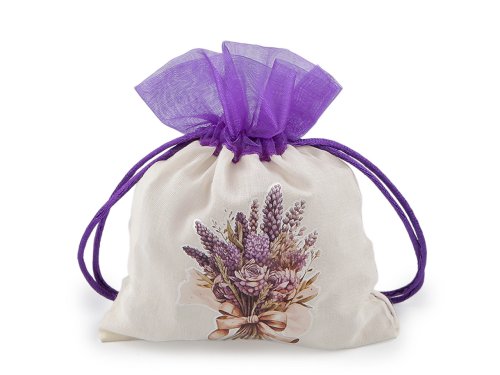 Plátěný dárkový pytlík je ozdobený pogumovaným potiskem kytice s levandulí. Nahoře je olemovaný organzou. Snadno se uzavírá pomocí dvou stahovacích saténových šňůrek. Pytlík působí luxusně, můžete do něj zabalit dárky, uschovat vaše osobní poklady nebo naaranžovat voňavé sušené květy.