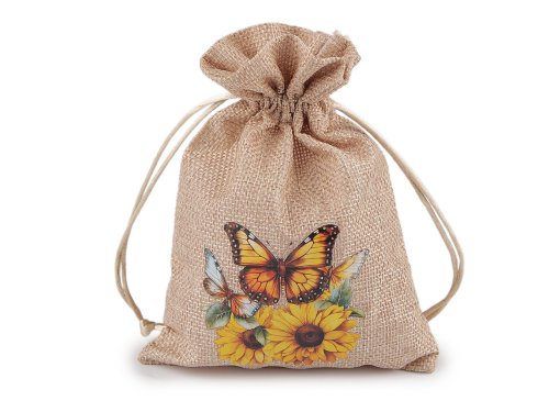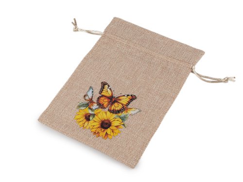 Dárkový pytlík s potiskem slunečnic je skvělý na rychlé zabalení malých dárků. Materiál pytlíku svým zpracováním připomíná jutu. Uzavírá se pomocí stahovacích saténových šňůrek. Potisk je na přední straně pytlíku, je pogumovaný. Použití: do pytlíku můžete zabalit dárky, uschovat vaše osobní poklady nebo naaranžovat voňavé sušené květy.
