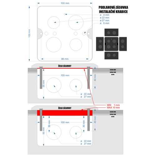 *zásuvka 1x 230V (kolík) + 1 x RJ45 včetně keystonu RJ45 cat.5e *včetně instalační podlahové krabice *vystřelovací otevírání *hliníkové provedení *rozměry: 122 x 122 x 65 mm