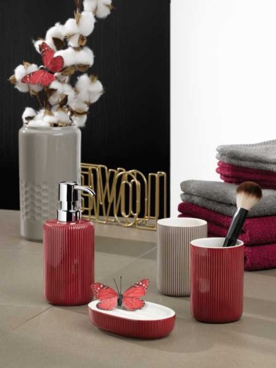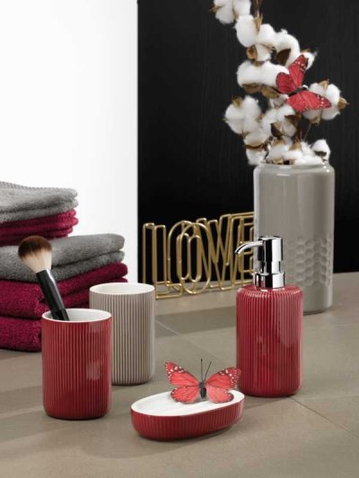Barva pro vaši koupelnu: velký, krásný keramický dávkovač mýdla Ava o objemu 350 ml. Nápadná je malinová červená barva dávkovače mýdla. Výměnná hlava čerpadla je vyrobena z plastu, pochromovaná. Výška: 17,5 cm Keramika 7,5 cm, v. 19 cm