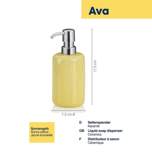 Elegantní dávkovač mýdla Ava vyrobený z lesklé keramiky ve slunečně žluté barvě. Dávkovač má vyměnitelnou hlavu pumpy z pochromovaného plastu.