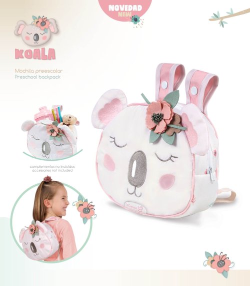 DeCuevas 10579 Dětský batůžek KOALA 2024 patří do stejnojmenné kolekce, která je novinkou roku 2024 a nabízí nejen kočárky, ale i jiné doplňky pro malé slečny a jejich panenky. Tato dívčí kolekce KOALA je doslova něžnost sama. Batůžek je ve tvaru spícího medvídka s květinou za ouškem. V provedení se střídá bílá s drobným květinovým potiskem s lososově růžovým jednobarevným materiálem. Tento motiv doprovází každý výrobek z kolekce.