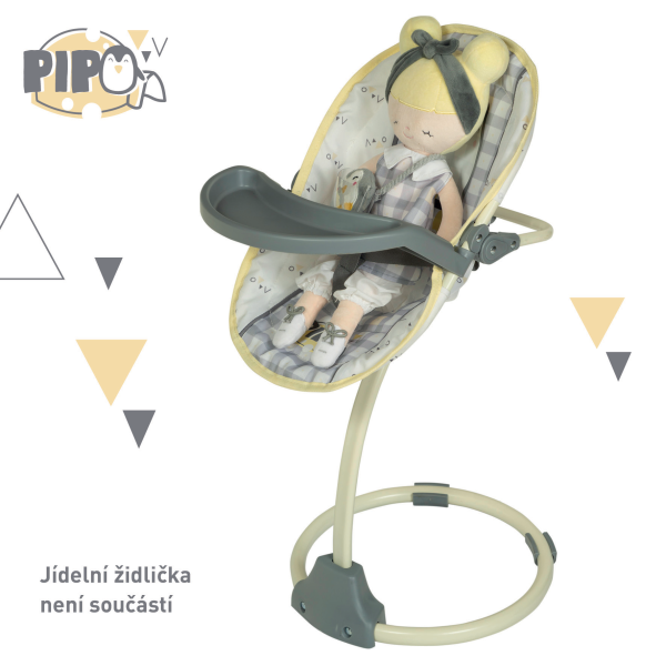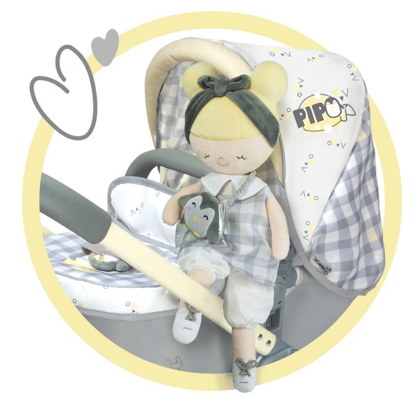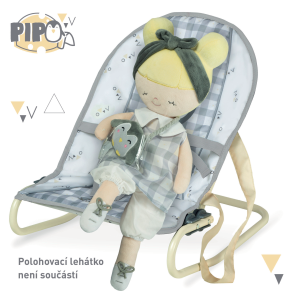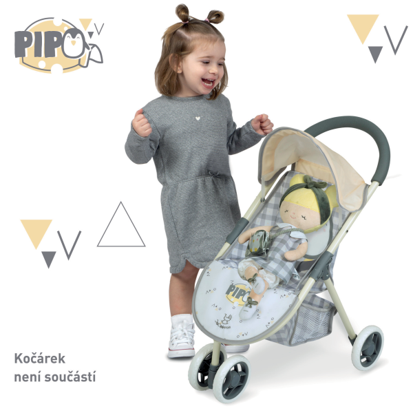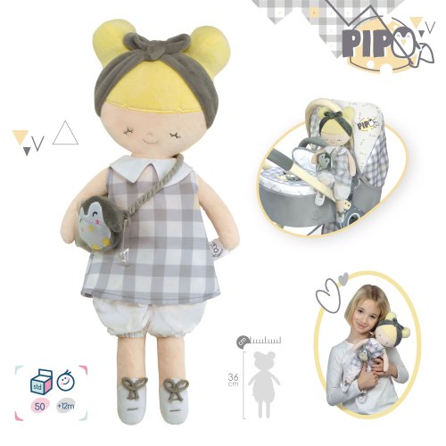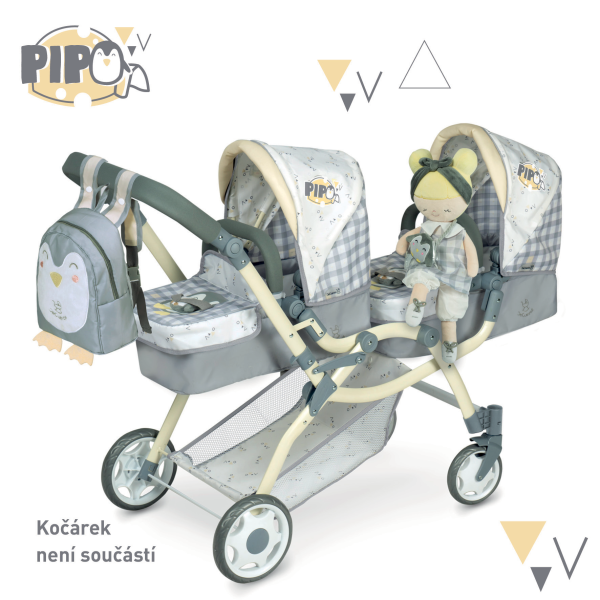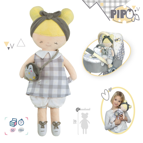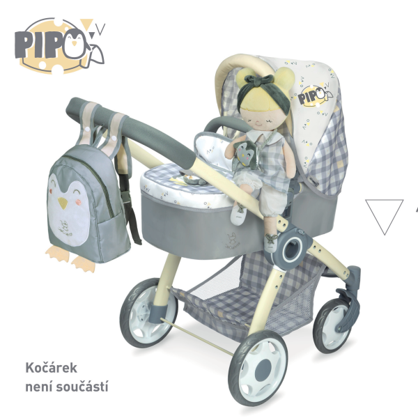 Plyšová panenka PIPO je malá slečna s plyšovým tučňáčkem, patřící do stejnojmenné kolekce, která je novinkou roku 2022 a nabízí kromě různých druhů kočárků a nábytku pro panenky i další doplňky pro budoucí hospodyňky. Charakteristická je pro ni šedobílá kostka v kombinaci s jednobarevnými šedivými a bílými drobně vzorovanými částmi a doplňky v jemně žluté barvě a již zmíněným tučňákem PIPO. Panenka je vyrobena z vysoce kvalitního hladkého lesklého plyše a je pratelná (ručně na 30 °C). Díky své velikosti a lehoučké váze je ideální společnicí každé malé holčičky nejenom na cestách, ale díky měkkému materiálu je příjemná i na mazlení do postýlky. Panenka je balena v igelitovém obalu. Velikost 36 cm. Doporučený věk 12m +.