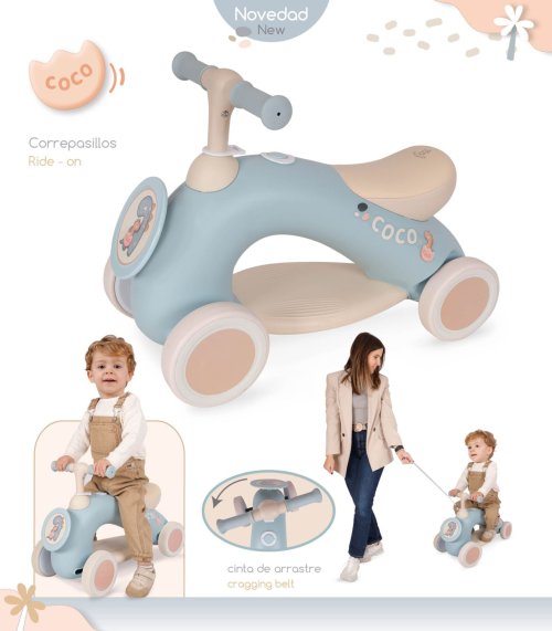 DeCuevas 30080 Moje první odrážedlo COCO 2024 patří do stejnojmenné kolekce, která je novinkou roku 2024 a nabízí nejen kočárky, ale i jiné doplňky nejen pro malé slečny a jejich panenky, ale také pro chlapce. V hravé kolekci COCO je dominantní obrázek dinosauří maminky se svým roztomilým mláďátkem, které nese na zadečku ještě vaječnou skořápku. Potisk malého dinosauříka na jemně holubičí šedomodré látce je základem celé kolekce, již zdobí prvky v pískové nebo narůžovělé barvě, která se promítá i do většiny nosných konstrukcí.