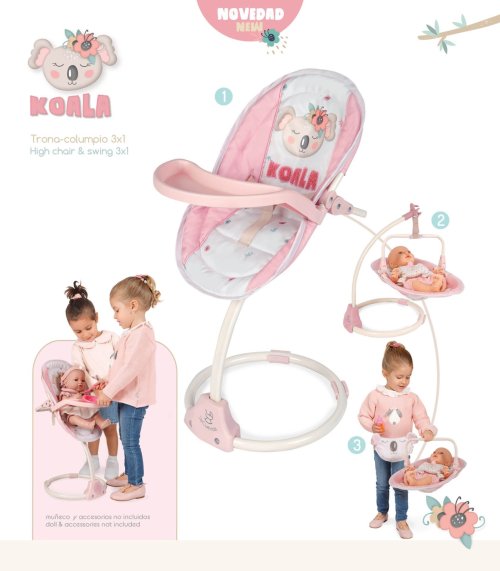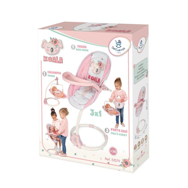 DeCuevas 51579 Multifunkční jídelní židlička a houpačka pro panenky 3 v 1 KOALA 2024 patří do stejnojmenné kolekce, která je novinkou roku 2024 a nabízí nejen kočárky, ale i jiné doplňky pro malé slečny a jejich panenky. Tato dívčí kolekce KOALA je doslova něžnost sama. Spící medvídek s květinou za ouškem je velmi roztomilý. Tento motiv doprovází každý výrobek z kolekce. V provedení se střídá bílá s drobným květinovým potiskem s lososově růžovým jednobarevným materiálem.Doplňky a vybavení:• Odnímatelné oboustranné sedátko-lehátko s bezpečnostními popruhy pro uchycení panenky, které může být díky dvěma různým způsobům připevnění na moderní konstrukci využito jako jídelní židlička nebo houpačka, ale i samostatně jako nosítko.• Odnímatelný plastový pultík na krmení• Rozměry židličky: 31 × 30 x 60 cm (d x š x v)• Výška k jídelnímu pultíku: 50 cm • Panenka s doplňky nejsou součástí baleníDoplňující informace:• Nádherný španělský design• Precizní zpracování• Velmi snadná manipulace během samotné hry• Materiál: kov, plast, textil• Baleno v krabici v barvách kolekce• Rozměry balení: 32 x 10 x 40 cm (d x š x v)• Váha balení: 1,24 kg• U vybraných modelů je na obalech QR kód s video návodem na sestavení • Doporučený věk od 3 letDeCuevas 51579 Multifunkční jídelní židlička a houpačka pro panenky 3 v 1 KOALA 2024, ze stejnojmenné kolekce, která je novinkou roku 2024. Tato designová moderní židlička rozhodně není jen ideálním pomocníkem při krmení panenky, ale slouží i jako houpačku nebo n