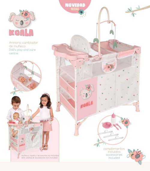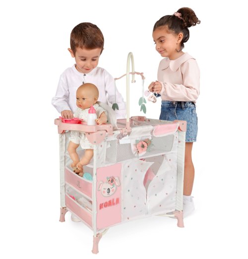 DeCuevas 53079 Skládací postýlka pro panenky s 5 funkčními doplňky KOALA 2024 patří do stejnojmenné kolekce, která je novinkou roku 2024 a nabízí nejen kočárky, ale i jiné doplňky pro malé slečny a jejich panenky. Tato dívčí kolekce KOALA je doslova něžnost sama. Spící medvídek s květinou za ouškem je velmi roztomilý. Tento motiv doprovází každý výrobek z kolekce. V provedení se střídá bílá s drobným květinovým potiskem s lososově růžovým jednobarevným materiálem.Doplňky a vybavení:• Kolotoč s lístečky (výška 34 cm)• Přebalovací pultík (17 x 27 cm)• Jídelní židlička a plastový set s lahví, miskou a příborem• Lůžková část (42 x 28 cm) se síťovaným okénkem • Velká šatna na zip s tyčkou a 3 ramínky na oblečení pro panenky (40 x 27 x 30 cm)• Dvě úložné poličky • Rozměry postýlky: 70 x 32 x 60 cm (d x š x v) • Panenka, oblečení a věci v poličkách nejsou součástí baleníDoplňující informace:• Nádherný španělský design• Precizní zpracování• Skládací model• Velmi snadná manipulace během samotné hry• Materiál: kov, plast, textil• Baleno v krabici v barvách kolekce• Rozměry balení: 61 x 14 x 32,5 cm (d x š x v)• Váha balení: 2,6 kg• U vybraných modelů je na obalech QR kód s video návodem na sestavení • Doporučený věk od 3 letDeCuevas 53079 Skládací postýlka pro panenky s 5 funkčními doplňky KOALA 2024, která je novinkou roku 2024, je u holčiček oblíbená díky svému rozmanitému příslušenství a úložnému prostoru, který ocení i pořádkumilovné maminky. Kolekce nabízí nejen kočárky, ale i jin