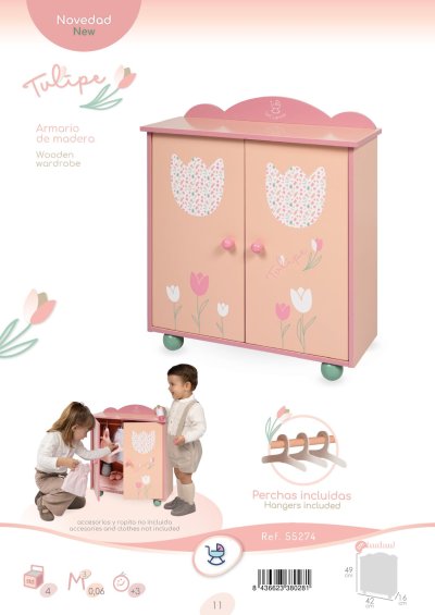 DeCuevas 55274 Dřevěná šatní skříň pro panenky s doplňky Tulipe 2025 ze stejnojmenné kolekce, která je novinkou roku 2025, je díky svým jemným pastelovým barvám krásným doplňkem dívčího pokojíčku a potěší jistě každou malou slečnu. Šatní tyč s ramínky poskytne dostatek prostoru pro uložení oblečků a různých doplňků pro panenky. Tulipe je, jak již sám název napovídá, kolekce plná tulipánů v překrásně sladěných teplých pastelových lososových barvách. Světlejší a tmavší odstíny barev jsou vkusně doplněné drobným květinovým vzorem ve stejných tónech na bílosmetanovém podkladu. Tento motiv ještě navíc u kočárků umocňují svým tematickým tvarem i překrásné, jako tulipán vypadající tašky. Květ tulipánu zdobí i dřevěné výrobky této kolekce. Tato kolekce nabízí výběr výrobků od jídelních sad přes postýlky a kočárky až po dřevěný nábytek pro panenky. Nádherný španělský design, precizní zpracování. Materiál: MDF, masivní dřevo, kov. Baleno v krabici v barvách kolekce. Doporučený věk od 3 let.