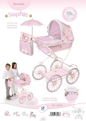 DeCuevas 81075 Skládací kočárek pro panenky s taškou a doplňky Sophie 2025 - 81 cm patří do stejnojmenné kolekce, která je novinkou roku 2025 a nabízí nejen zmíněné kočárky, ale i jiné doplňky pro malé slečny a jejich panenky. Něžná dívčí kolekce Sophie je nepřehlédnutelná pro každé děvčátko. Světle růžová barva dominuje celé kolekci. Doplněná je o světle šedivé a bílé kraječky a mašličky, které zdobí všechny výrobky této rozmanité kolekce a ještě více podtrhují nádech romantiky.