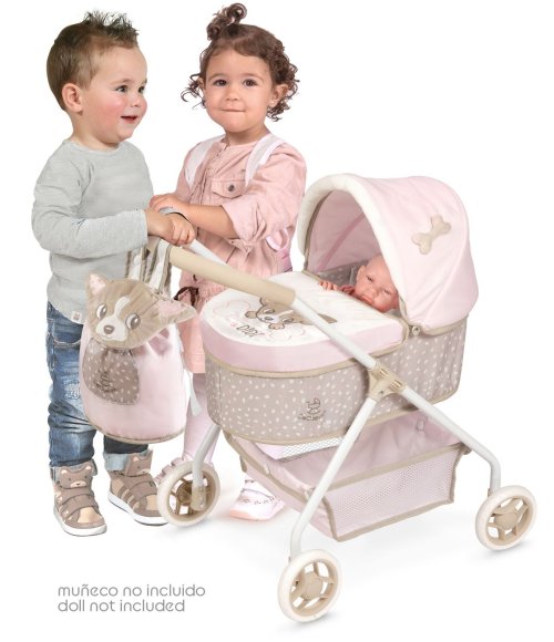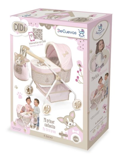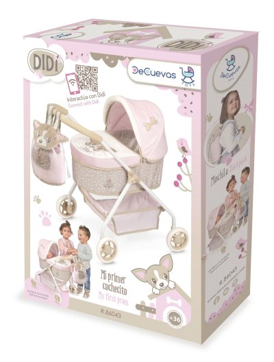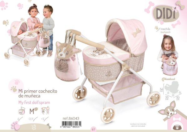 DeCuevas 86043 Můj první kočárek pro panenky s batůžkem DIDI 2021 - 56 cm je z doslova okouzlující, něžné, růžovo bílo hnědé kolekce s malým roztomilým štěňátkem DIDI. Tato kolekce je úplnou novinkou roku 2021 a nenabízí pouze nové barvy, ale přináší i několik zcela nových typů kočárků a jejich nové designové zpracování. Vše navíc umocňuje i kombinace použitých běžných hladkých materiálů v kontrastu se sametovou výšivkou malého pejska čivavy a jinými sametovými doplňky. Doplňky a vybavení:• Ozdobný batůžek na kočárek nebo na záda s roztomilými oušky a veselým výrazem• Kryt na korbičku s očky pro uchycení • Úložný prostor v dolní části kočárku• Rozměry kočárku: 50 × 35 × 56 cm (výška k rukojeti)• Vnitřní rozměr korbičky: 40 x 23 cm (d x š)Doplňující informace:• Nádherný španělský design• Precizní zpracování• Velmi snadná manipulace během samotné hry• Materiál: kov, plast, textil• Baleno v krabici v barvách kolekce• Rozměry balení: 44,8 x 11 x 32 cm (d x š x v) • Váha balení: 2,38 kg• U vybraných modelů je na obalech QR kód s video návodem na sestavení • Doporučený věk od 3 letDeCuevas 86043 Můj první kočárek pro panenky s batůžkem DIDI 2021 – 56 cm, z doslova okouzlující, něžné, růžovo bílo hnědé kolekce s malým roztomilým štěňátkem DIDI, je díky nízké rukojeti, stabilní konstrukci a lehké váze vhodný především pro úplně malé slečny. K jeho kouzelnému vzhledu přispívá i kombinace použitých běžných hladkých materiálů v kontrastu se sametovou výšivkou malého pejska a jinými same