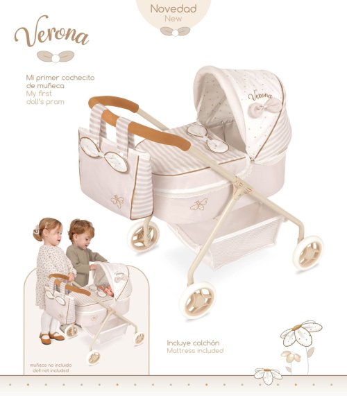 DeCuevas 86078 Můj první kočárek pro panenky s taškou Verona 2024 - 56 cm patří do stejnojmenné kolekce, která je novinkou roku 2024 a nabízí nejen zmíněné kočárky, ale i jiné doplňky pro malé slečny a jejich panenky. Tato decentní kolekce je celá nesena v jemných pastelových přírodních barvách i vzorech. Kombinace světle béžové a bílé s roztomilými puntíky nebo proužky doplňuje světle hnědé úzké lemování, které zdůrazňuje dokonalost tvarů a krásně ladí s hnědými madly kočárků. Přírodní styl kolekce podtrhují aplikace mašliček zobrazující okvětní lístky a drobné výšivky včeliček.