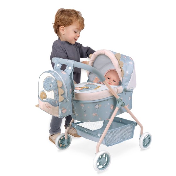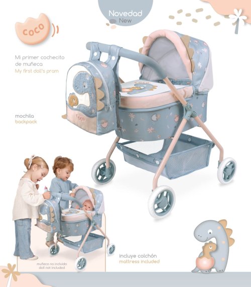 DeCuevas 86080 Můj první kočárek pro panenky s batůžkem COCO 2024 - 56 cm patří do stejnojmenné kolekce, která je novinkou roku 2024 a nabízí nejen kočárky, ale i jiné doplňky nejen pro malé slečny a jejich panenky, ale také chlapce. V hravé kolekci COCO je dominantní obrázek dinosauří maminky se svým roztomilým mláďátkem, které nese na zadečku ještě vaječnou skořápku. Potisk malého dinosauříka na jemně holubičí šedomodré látce je základem celé kolekce, již zdobí prvky v pískové nebo narůžovělé barvě, která se promítá i do většiny nosných konstrukcí.Doplňky a vybavení:• Ozdobný batůžek na kočárek nebo záda s motivem dinosauří maminky s jejím mláďátkem• Barevný kryt na korbičku s očky pro uchycení s motivem dinosauří maminky s jejím mláďátkem• Matrace• Úložný prostor v dolní části kočárku• Rozměry kočárku: 50 × 35 × 56 cm (výška k rukojeti)• Vnitřní rozměr korbičky: 40 x 23 cm (d x š) • Panenka není součástí baleníDoplňující informace:• Nádherný španělský design• Precizní zpracování• Velmi snadná manipulace během samotné hry• Materiál: kov, plast, textil• Baleno v ozdobné krabici v barvách kolekce• Rozměry balení: 44,8 x 11 x 32 cm (d x š x v) • Váha balení: 2,38 kg• U vybraných modelů je na obalech QR kód s video návodem na sestavení • Doporučený věk od 3 letDeCuevas 86080 Můj první kočárek pro panenky s batůžkem COCO 2024 - 56 cm, ze stejnojmenné kolekce, která je novinkou roku 2024, je díky nízké rukojeti, stabilní konstrukci a lehké váze vhodný především pro úplně malé sle