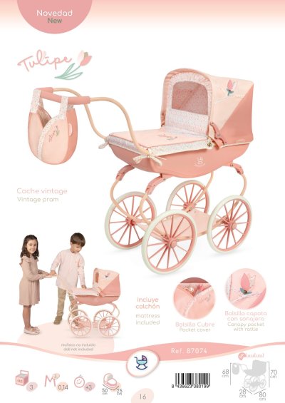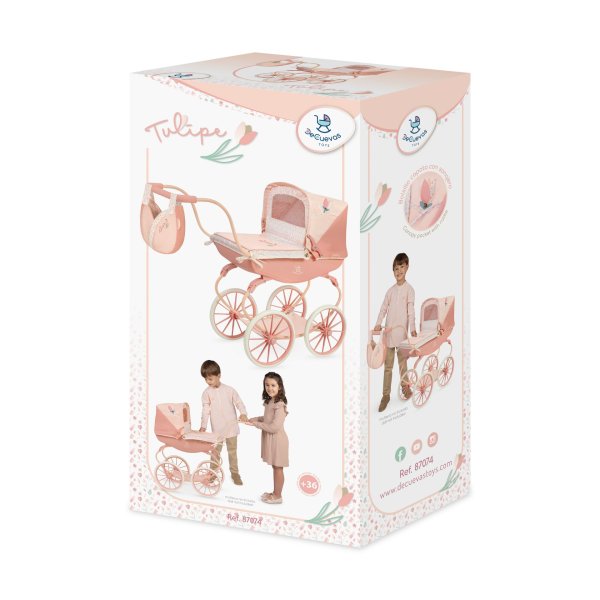 DeCuevas 87074 Kočárek pro panenky hluboký Tulipe 2025 - 68 cm patří do stejnojmenné kolekce, která je novinkou roku 2025 a nabízí výběr výrobků od jídelních sad přes postýlky a kočárky až po dřevěný nábytek pro panenky. Tulipe je, jak již sám název napovídá, kolekce plná tulipánů v překrásně sladěných teplých pastelových lososových barvách. Světlejší a tmavší odstíny barev jsou vkusně doplněné drobným květinovým vzorem ve stejných tónech na bílosmetanovém podkladu. Tento motiv ještě navíc u kočárků umocňují svým tematickým tvarem i překrásné, jako tulipán vypadající tašky. Květ tulipánu zdobí i dřevěné výrobky této kolekce.