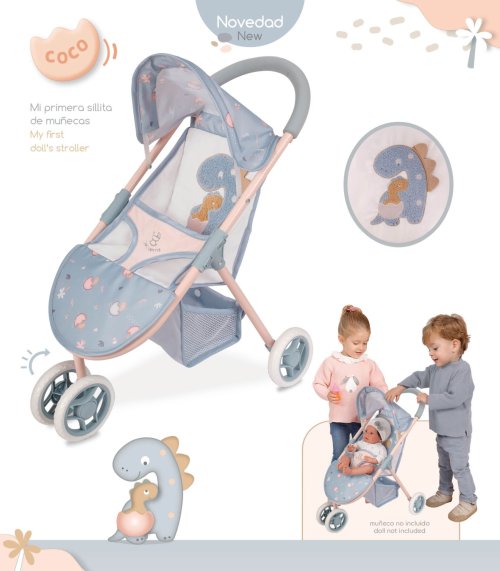 DeCuevas 90280 Sportovní kočárek pro panenky tříkolový COCO 2024 - 55 cm patří do stejnojmenné kolekce, která je novinkou roku 2024 a nabízí nejen kočárky, ale i jiné doplňky nejen pro malé slečny a jejich panenky, ale také chlapce. V hravé kolekci COCO je dominantní obrázek dinosauří maminky se svým roztomilým mláďátkem, které nese na zadečku ještě vaječnou skořápku. Potisk malého dinosauříka na jemně holubičí šedomodré látce je základem celé kolekce, již zdobí prvky v pískové nebo narůžovělé barvě, která se promítá i do většiny nosných konstrukcí.