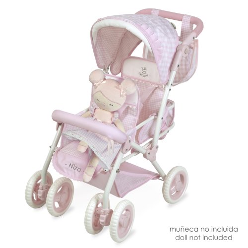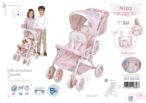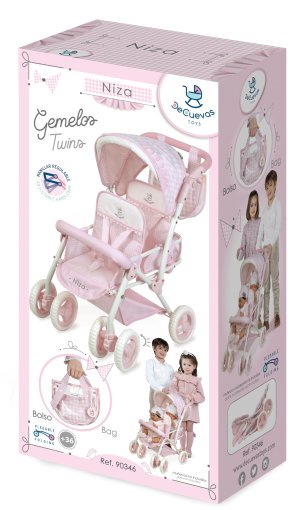 DeCuevas 90346 Skládací kočárek pro dvojčata panenky s taškou NIZA 2022 - 72 cm, ze stejnojmenné něžně růžové kolekce NIZA, která je novinkou roku 2022 je díky polohovatelné rukojeti a své konstrukci spíš vhodný pro slečny předškolního věku, ale i větší slečny. Kolekce NIZA nabízí krom různých druhů kočárků i nábytek pro panenky a malé parádnice. Nádherný španělský design, precizní zpracování. Skládací model, velmi snadná manipulace během samotné hry. Materiál: kov, plast, textil. Baleno v krabici v barvách kolekce. Doporučený věk od 3 let.