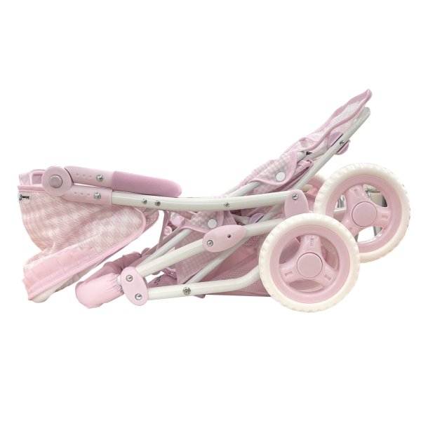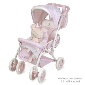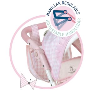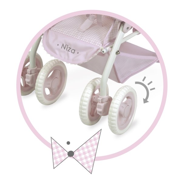 DeCuevas 90346 Skládací kočárek pro dvojčata panenky s taškou NIZA 2022 - 72 cm patří do stejnojmenné něžně růžové kolekce NIZA která je novinkou roku 2022 a nabízí krom různých druhů kočárků i nábytek pro panenky a malé parádnice. Kolekce je vytvořena z jednobarevného růžového materiálu v kombinaci s růžovobílou drobnější kostičkou, zdobená růžovými lemy a bílými a růžovými drobnými i většími volánky. Vše působní velmi lehce a čistě.
