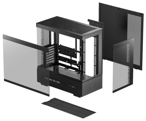 Stylová a prostorná skříň formátu Middle Tower s průhlednou bočnicí i předním panelem nabízí jednu 2,5/3,5" pozici pro HDD/SDD disk a dvě 2,5" pozice pro SSD disky. Díky možnosti osazení až deseti ventilátory skříň poskytuje více než dostatečné možnosti chlazení. Na boční straně se nachází dva USB 3.0 porty, jeden port USB-C a kombinovaný audio port pro sluchátka a mikrofon. Důmyslné řešení umožňuje pohodlné umístění až 420 mm dlouhého výměníku vodního chlazení na horní straně. Ve skříni je dostatek prostoru pro chladič CPU do výšky až 182 mm a grafickou kartu o délce až 450 mm. Základna skříně obsahuje digitální displej, který zobrazuje aktuální teplotu, výkon, spotřebu a otáčky ventilátorů. Displej se může v daném okamžiku zaměřit na tyto hodnoty u procesoru, grafické karty nebo napájecího zdroje. Mesh panely zajistí vysoký průtok vzduchu. Potěší také vestavěná podpěra pro grafickou kartu. Skříň je dodávána bez zdroje a součástí balení je sada odnímatelných prachových filtrů.