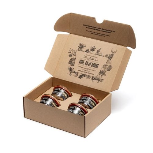 Sada obsahuje 4 degustační paštiky: srnčí paštiku s portským vínem (50 g), kachní paštiku s jablky (50 g), jelení paštiku s brusinkami (50g) a jemnou králičí paštiku (50g)