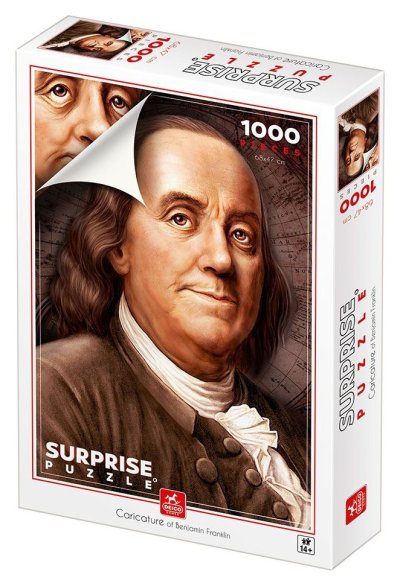 Portrét Benjamina Franklina, který vidíte na obalu, není ten, který skládáte. Výsledkem Vašeho snažení bude povedená karikatura tohoto známého politika. Rozměr složeného puzzle cca 47x 68 cm