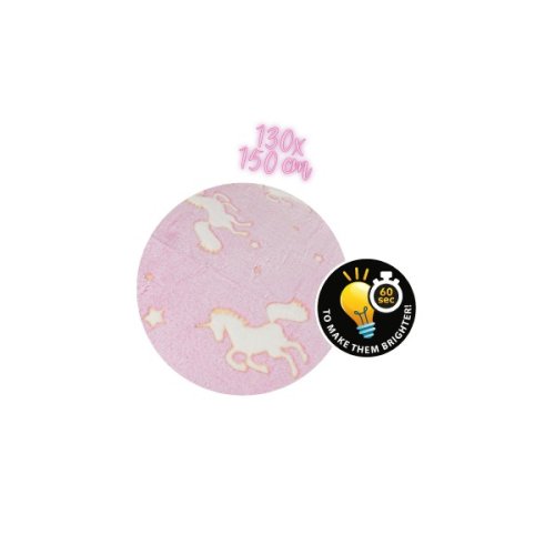 Plyšová deka po nasvícení svítí. Stačí pouhých 60 vteřin pod světlem, ovšem čím bude světlo intenzivnější, tím více a déle bude produkt ve tmě svítit. Doporučujeme nechat na světle „nasvítit“ co nejdéle, minimálně však 10 minut. Deku zdobí jednorožci, hvězdičky, které ve tmě opravdu svítí. Rozměr deky: 130 x 150 cm Rozměry balení: 25 x 32 x 10 cm