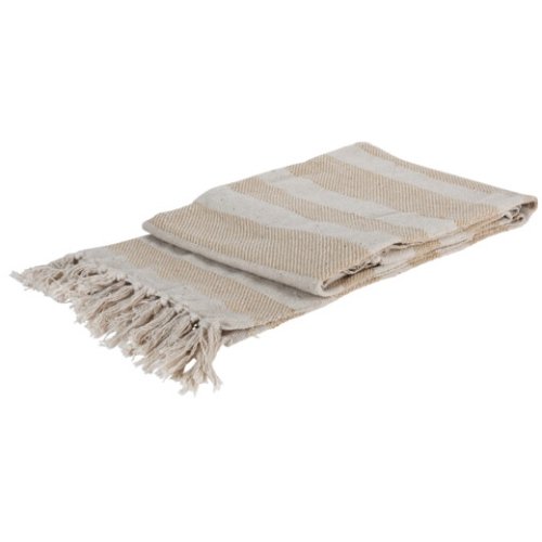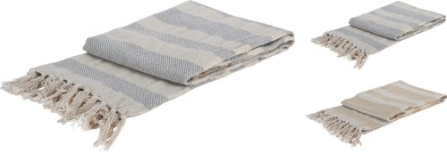 teplý bavlněný přehoz od značky HOMESTYLING- pěkný přehoz jistě zútulní každou ložnici i obývací pokoj- tuto přikrývku můžete využít k zakrytí peřin v ložnici- stejně dobře funguje jako pohodlná deka k zachumlání- je vyrobena ze 100% bavlny- na dvou stranách má deka střapce- celkové rozměry: 130 x 170 cm- barva: béžové pruhy- značka: HOMESTYLING