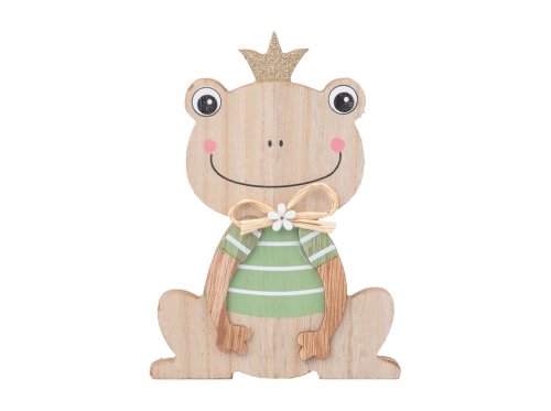 Tato dřevěná žabka s korunkou a glitrovým detailem je veselou a originální dekorací. V přírodní barvě a se zelenými akcenty je ideální pro jarní a letní výzdobu, přináší šmrnc a kouzlo každému prostoru. Její velikost je 120x180mm.