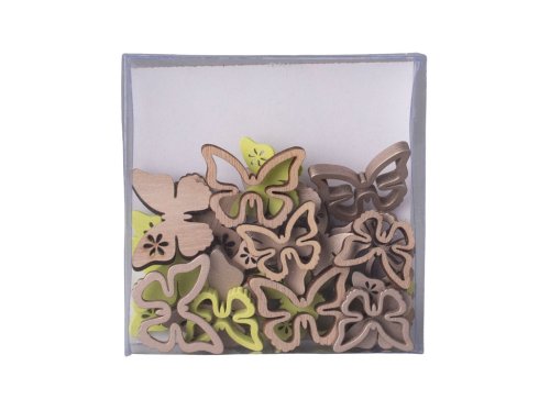 Dekorace dřevění motýli mix přírodní zelená hnědá 24ks přináší do vašeho domova přírodní kouzlo s barevnými detaily. Set obsahuje 24 motýlů v přírodní zelené a hnědé barvě, které jsou ideální pro ozdobení různých povrchů. Je skvělý pro jarní dekorace. Její rozměry jsou 35x30/25x20mm. Zboží je dodáváno v mixu. Doručované zboží je vybíráno náhodně a nelze vybrat konkrétní provedení.