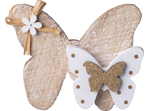 Tato dřevěná dekorace motýlka v přírodní bílé barvě s jemným glitrovým akcentem přinese do vašeho interiéru kousek elegance a jarního kouzla. Ideální pro ozdobení stolu nebo jako součást květinových aranžmá. Jejich velikost je 120x100mm.