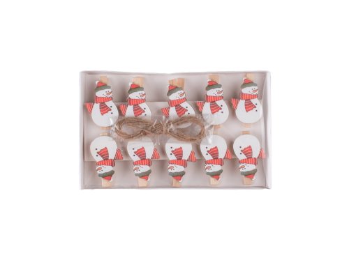 Dekorace dřevo 10 ks 30x50 mm sněhulák na kolíčku v krabičce, bílá, červená