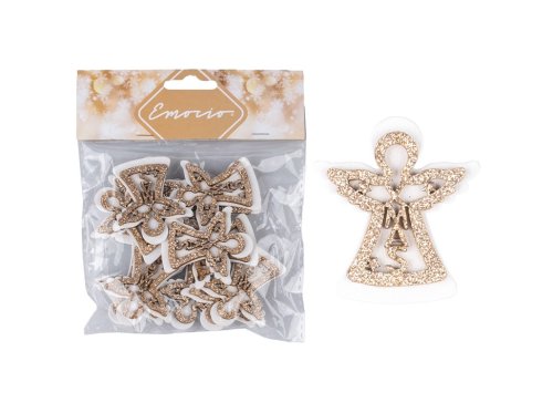 Dekorace dřevo 12 ks 43x48mm andílci s lepíkem , přírodní s glitrem, zlatá
