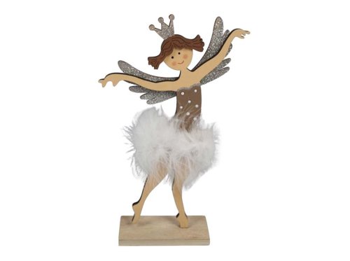 Dekorace dřevo 175X290mm Anděl na postavení s korunkou, přírodní s glitrem+bílá, hnědá
